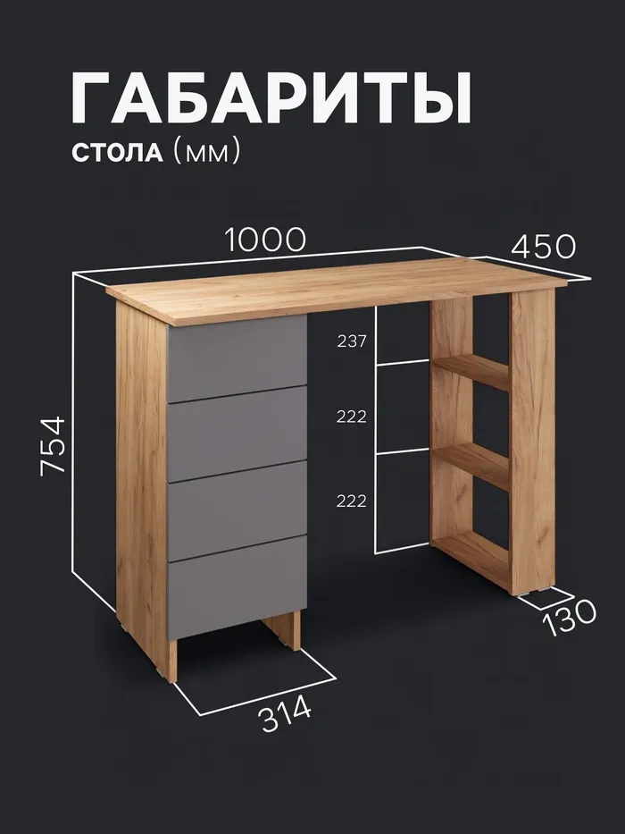 Стол письменный «Лайт», с полками, 4 ящика, 1000×450×754 мм цвет дуб золотой крафт/серый шифер — Характеристики