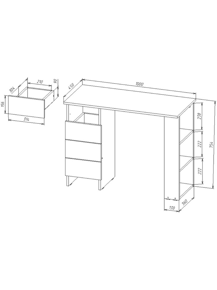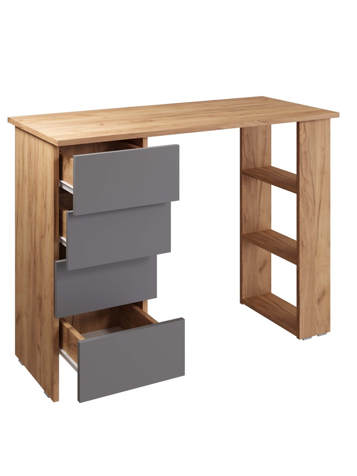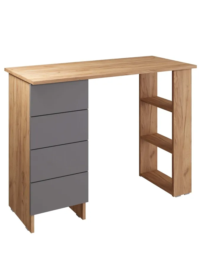 Предмет мебели представляет собой решение для создания функциональной рабочей зоны: письменный стол, дополненный открытыми полками и четырьмя вместительными ящиками для системного хранения. Изготовлен из практичного ЛДСП в актуальных цветовых решениях.