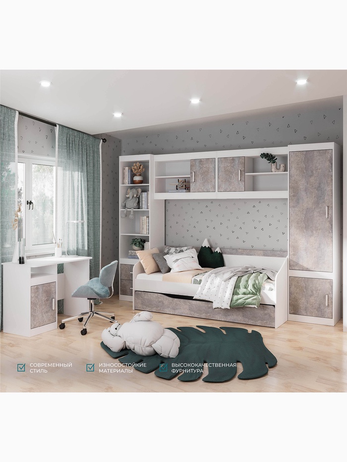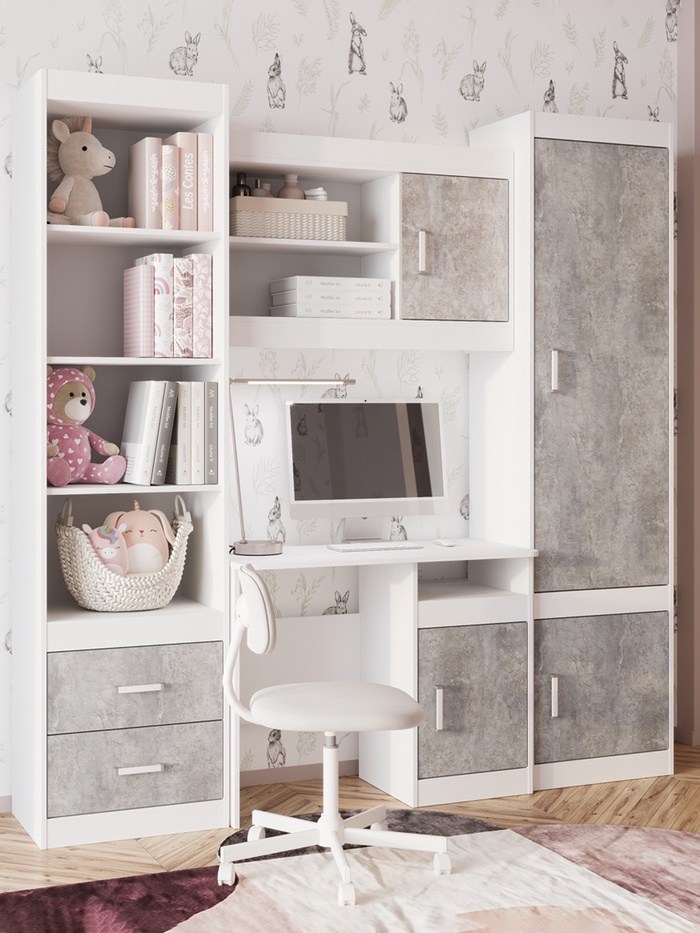 Подходит для организации рабочего пространства в детской комнате или кабинете. Обеспечивает удобную поверхность для учёбы, работы и хранения канцелярии. Поможет разместить все необходимые документы, вещи или канцелярские принадлежности можно в открытой нише или закрытых полках, находящихся под столешницей.