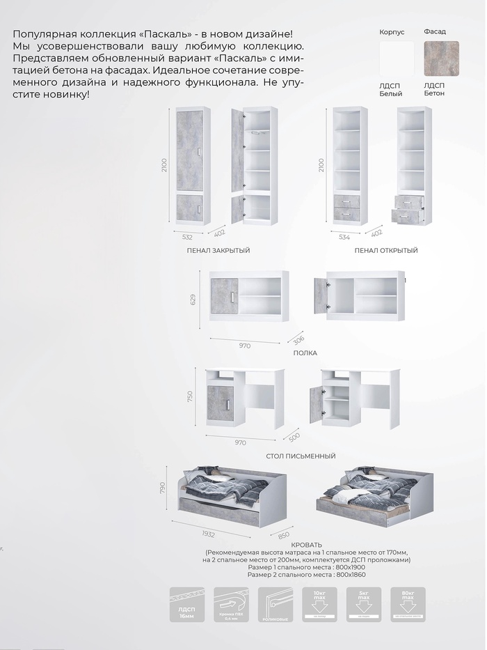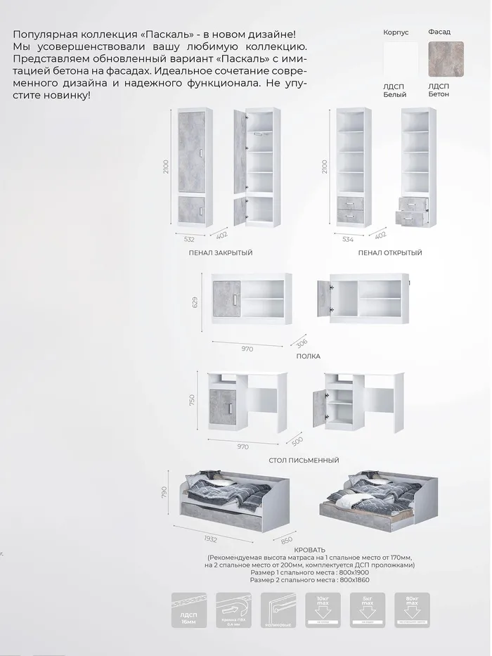 Стол письменный «Паскаль», 970×753×500 мм, цвет белый/цемент светлый — Характеристики