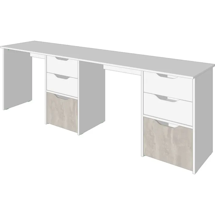 Стол письменный тандем Мико - сделает ваше рабочее пространство комнаты функциональным и стильным. Современный дизайн, гладкие фасады без ручек – ничто не будет отвлекать от решения поставленных задач. На просторной столешнице хватит места для двух ноутбуков или компьютеров, а две тумбы (с тремя выдвижными ящиками) способны вместить всё необходимые для учебы, работы или творчества принадлежности.