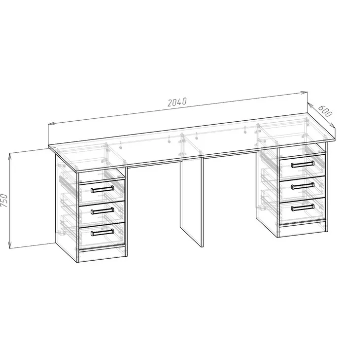 - Расстояние между левым ящиком и центральной опорой стола: 592 мм.