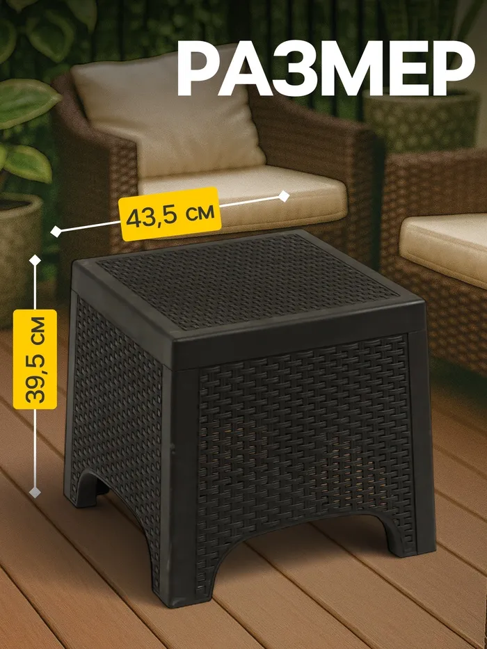 Компактный кофейный столик из прочного пластика с эффектом натурального ротанга. Идеальные габариты 43.5×39.5 см подойдут для небольших пространств. Благородный цвет ""мокко"" добавит уюта в интерьер.