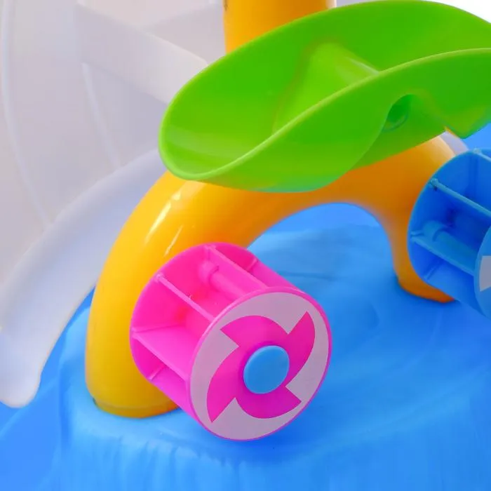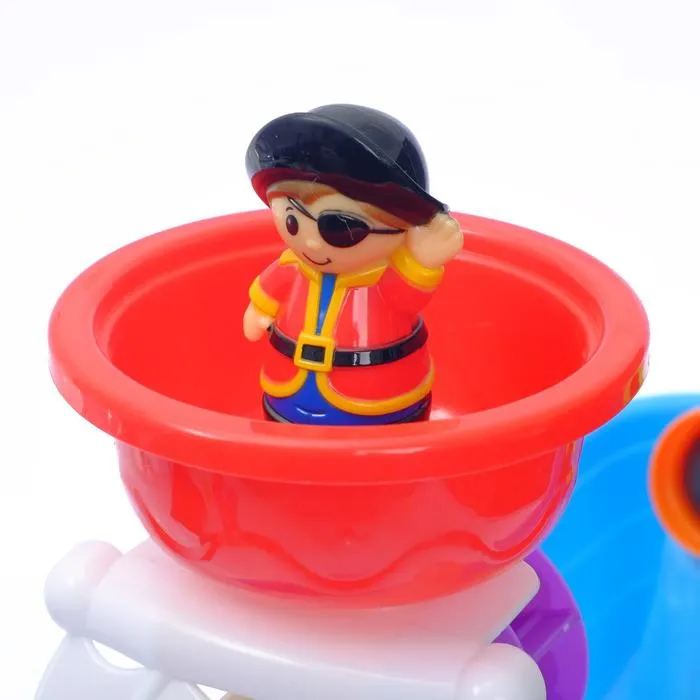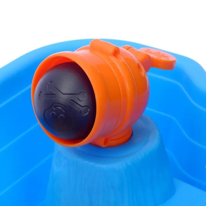 Превращаем столик в корабль морских разбойников, украшаем его пальмой, ставим на мачту фигурку капитана, наливаем воду в судно, запускаем шлюпки и через трубу стреляем шариками по игрушкам — веселью малыша не будет предела!
