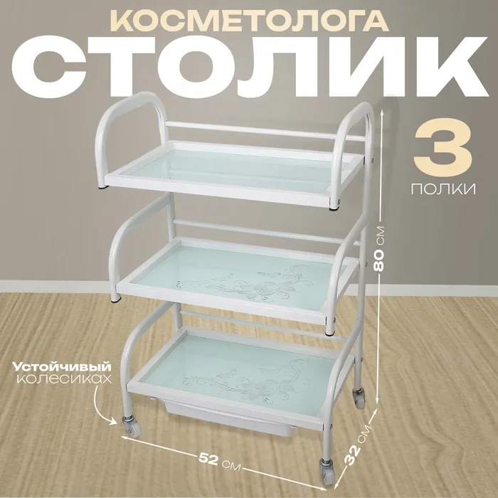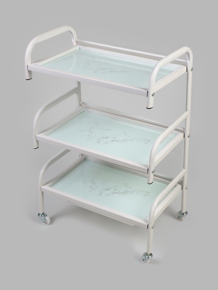 Столик косметолога, 52×32×80, на колесах, 3 полки, цвет белый, стекло