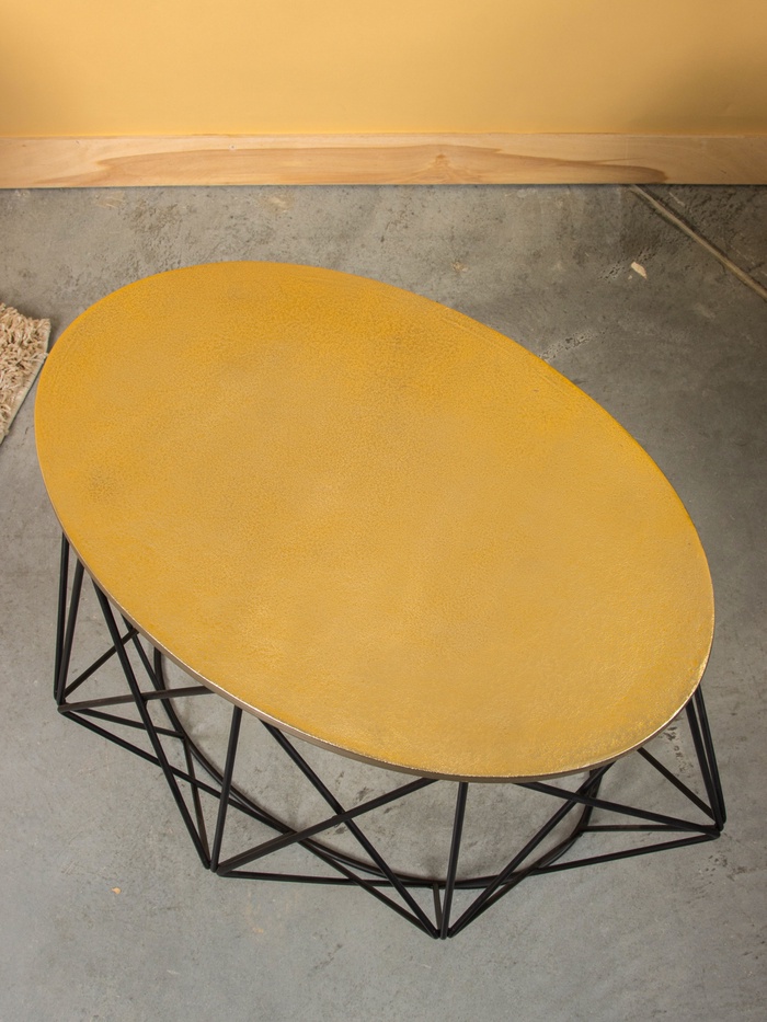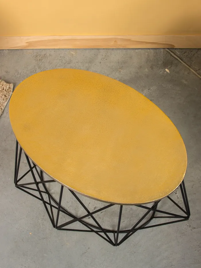 Журнальный столик «Геометрия» с золотистой овальной столешницей 71×51 см и ажурным черным основанием, напоминающим переплетение геометрических фигур. Контраст золотого и черного создает эффектный современный дизайн. Высота 58 см идеально подходит для использования с диванами и креслами.