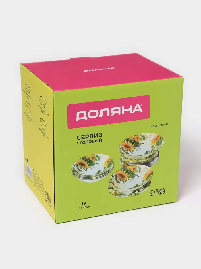 Столовый сервиз Доляна «Подсолнухи», 19 предметов: салатник 1 шт., тарелка десертная 6 шт., тарелка обеденная 6 шт., тарелка суповая 6 шт., стекло,... — Характеристики