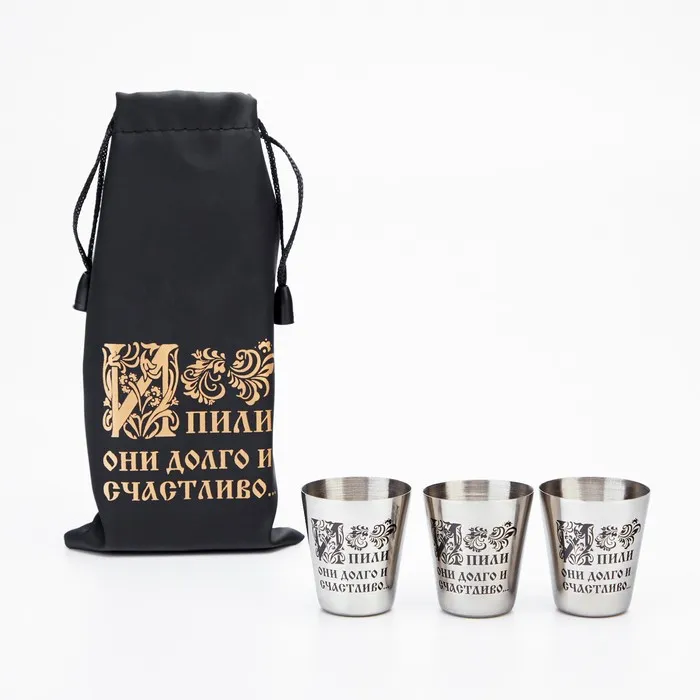 Набор стопок из 3 штук по 30 мл из пищевой нержавеющей стали с удобным и компактным мешочком с завязками для хранения и переноски. Легкие и компактные, удобно брать с собой на отдых, рыбалку, охоту, природу или в путешествия.