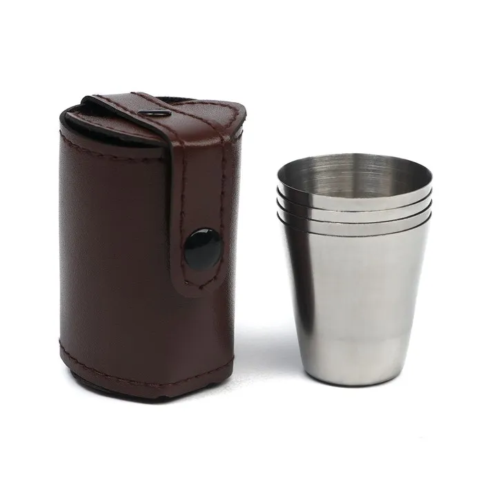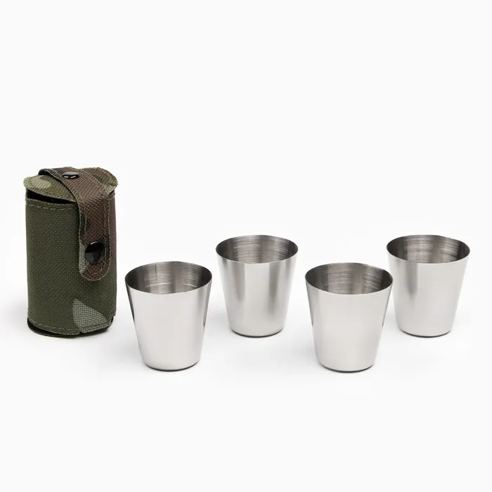 Набор стопок из 4 штук по 70 мл из пищевой нержавеющей стали в компактном чехле. Легкие и компактные, удобно брать с собой на отдых, рыбалку, охоту, природу или в путешествия.