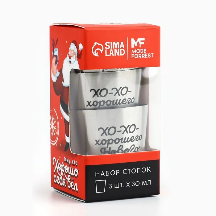Новогодний набор стопок «Тому, кто хорошо себя вел» состоит из трёх стопок объёмом 30 мл каждая. Стопки выполнены из высококачественной нержавеющей стали, что гарантирует их долговечность и устойчивость к механическим повреждениям.