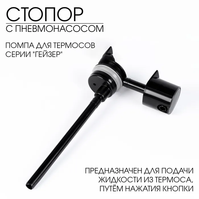 Запасная часть для термосов с пневмонасосом коллекции "Гейзер". Предназначен для подачи жидкости из термоса, путем нажатия нажимной кнопки, устанавливается в посадочную часть горловины термоса. Состоит из нескольких запрессованных друг в друга деталей: стопор, герметизирующая манжета стопора, нагнетательная трубка, всасывающая труба, крышка носика термоса и др. Манжета и трубка снимаются для промывки. Длина всасывающей трубки предусмотрена для установки в самый длинный термос Гейзер обьемом 3 литра. Однако, стопор можно использовать и для термосов Гейзер тип А с разным обьемом - 1,75 литра, 2 литра, 2,5 литра предварительно самостоятельно сократив всасывающую трубку на необходимую длину, отрезая нижнюю часть трубки. Преимущества стопора для термоса: Изготовлен из пищевого пластика, безопасного для здоровья. Обеспечивает герметичное закрытие термоса, сохраняя тепло и свежесть напитков. Позволяет быстро и без проблем налить горячий напиток в чашку, без необходимости полного откручивания стопора. Легкий и компактный, не занимает много места. Долговечный и надежный, прослужит вам долгое время.