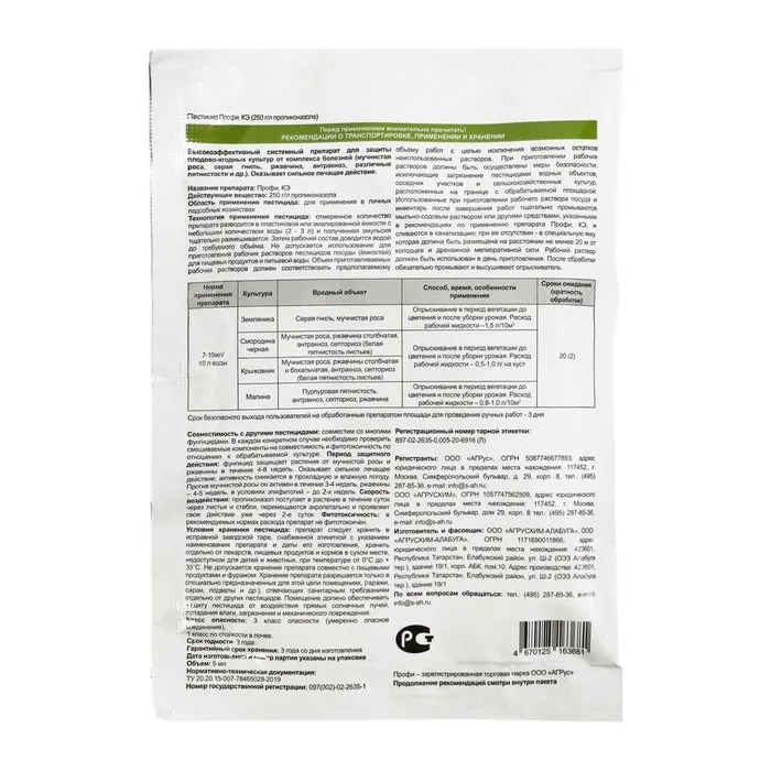 Фунгицид Профи помогает предотвратить и контролировать различные виды грибковых инфекций, таких как серая плесень, антракноз, мучнистая роса и другие.Характеристики:Тип: от болезней.Действующее вещество: пропиконазол.Объем: 5 мл.Преимущества:Тройное действие: с защитным, лечащим и искореняющим эффектом.«Стоп-эффект»: быстрое проникновение и быстрое начальное действие на патоген.Обладает высокой биологической активностью при низких нормах расхода.Болезни, вызванные грибками, могут привести к порче ягод и сократить их срок хранения. Применение фунгицида помогает предотвратить развитие этих болезней и сохранить ягоды в хорошем состоянии на протяжении длительного времени.