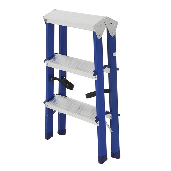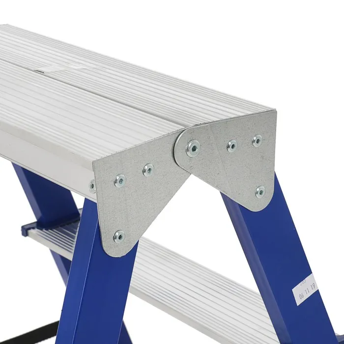 Стремянка выполнена из лёгких, но прочных материалов: каркас — из окрашенной стали, ступени — из алюминия.