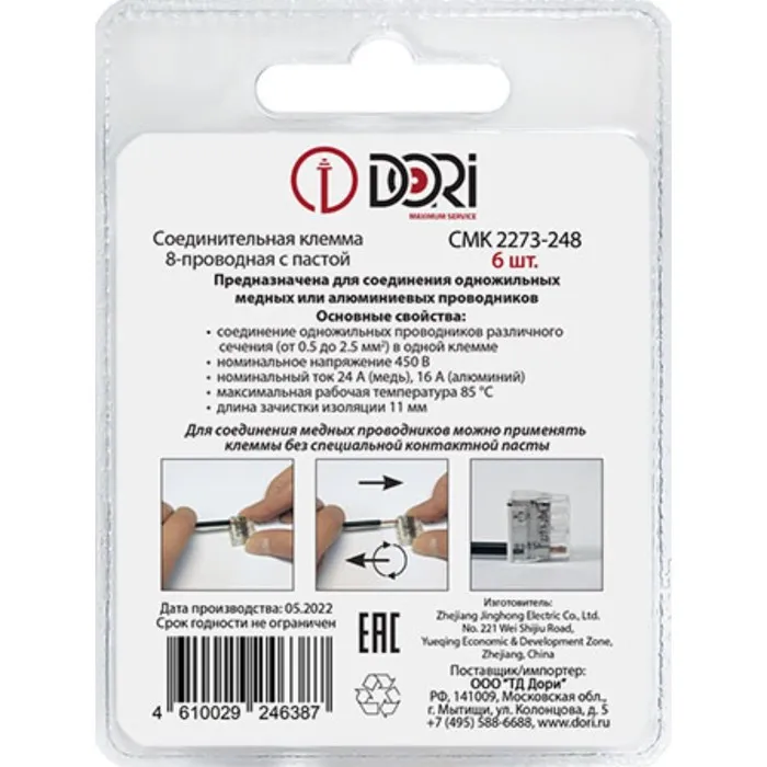 Строительно-монтажная клемма DORI (СМК 2273-248) 8-ми проводная с пастой, 6 шт. в блистере — Характеристики