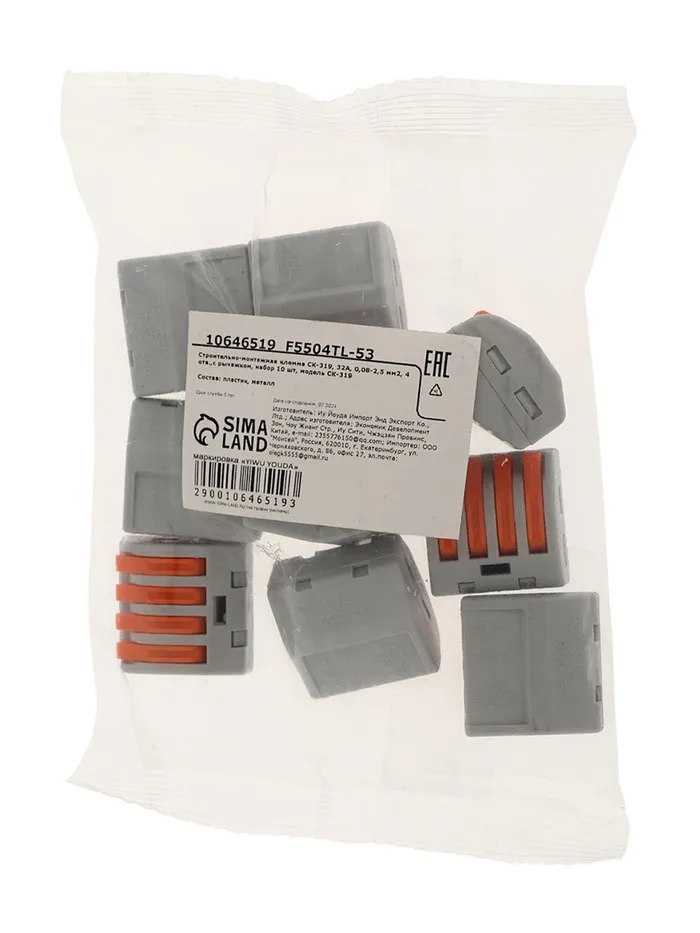 Строительно-монтажная клемма СК-319, 32А, 0,08-2,5 мм2, 4 отв., с рычажком, набор 10 шт — Характеристики