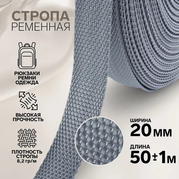 Стропа ременная, 20 мм, 50±1 м, плотность 8.2 гр/м, серая №19 — Характеристики