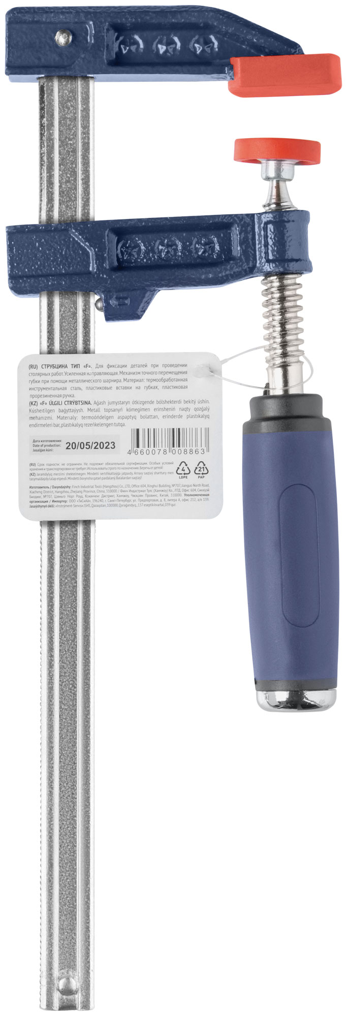 Эта струбцина отличается высоким качеством сборки и удобством в использовании. Мягкая прорезиненная ручка снижает нагрузку на руку, а усиленная конструкция позволяет выдерживать значительные усилия при фиксации.