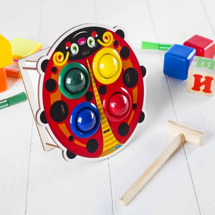 Игра со стучалкой помогает развивать мелкую моторику, координацию движений и концентрацию внимания. Ребёнок учится точно бить молоточком, тренируя мышцы рук и улучшая ловкость. Яркие цвета и забавная форма «божьей коровки» стимулируют интерес к игре, делая процесс обучения весёлым и увлекательным.