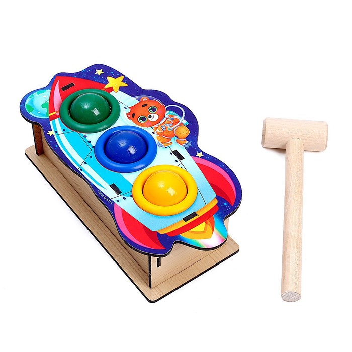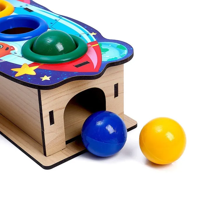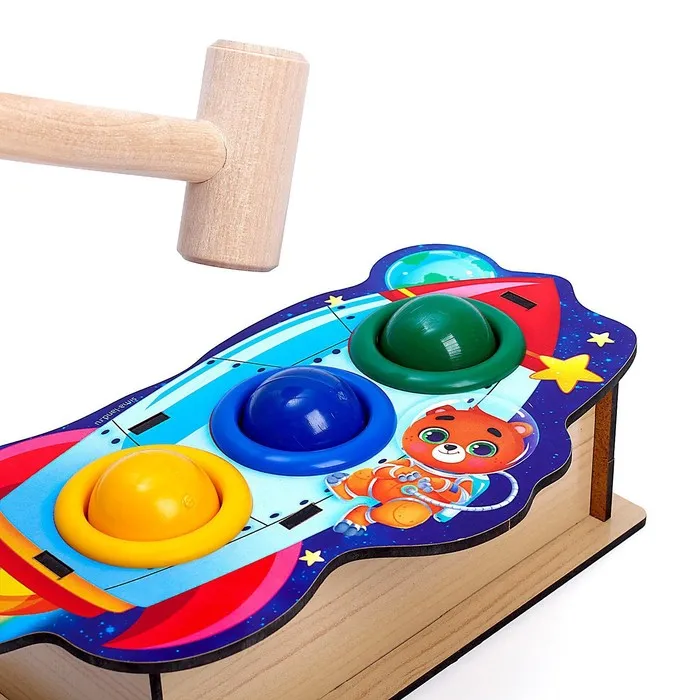 Юный испытатель берет в руки деревянный молоток, который входит в комплект, и забивает им шарик в отверстие. Когда достигнута цель, и круглый элемент попал в лунку, он выкатывается из коробочки! То же самое проделывается с остальными тремя шарами. Такое увлекательное и захватывающее занятие развивает у малышей мелкую моторику, координацию движений и целеустремленность, а также тренирует мышцы рук.