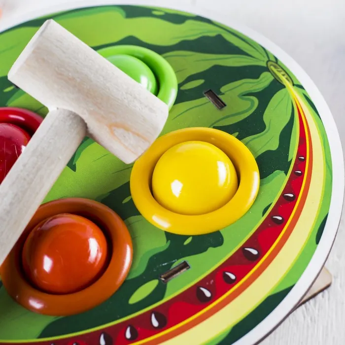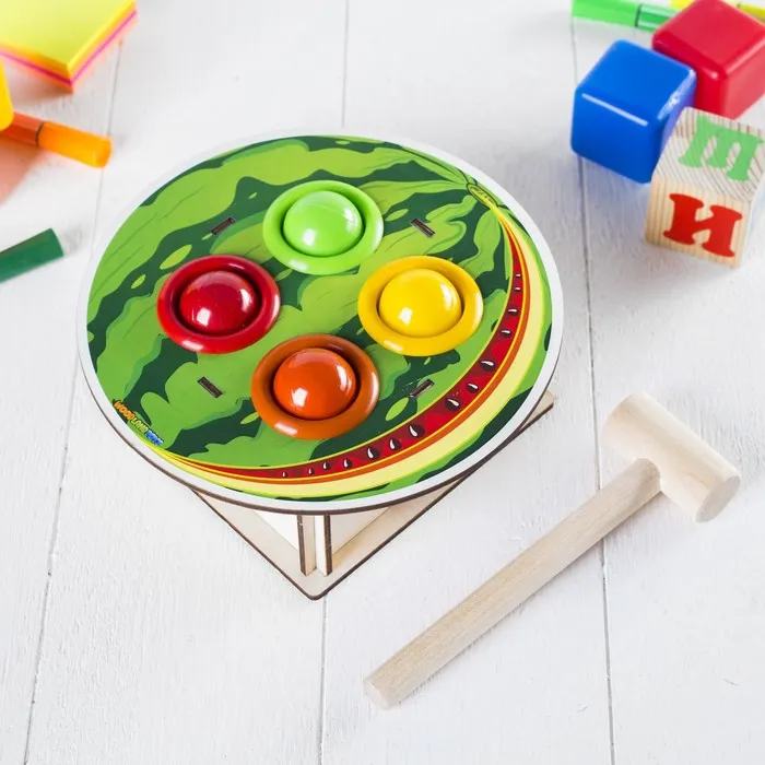 Сортер станет отличным подарком для любого ребёнка. Он не только увлекательно проведёт время, но и получит полезные навыки, играя с молотком и шариками. Забавный дизайн в виде арбуза обязательно привлечет внимание малыша и станет любимой игрушкой в доме.