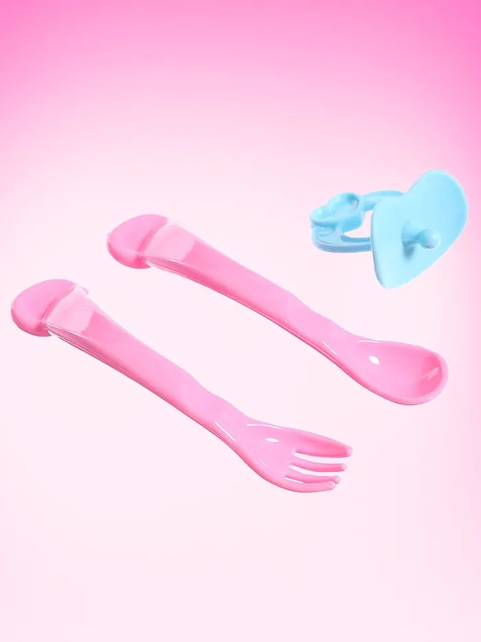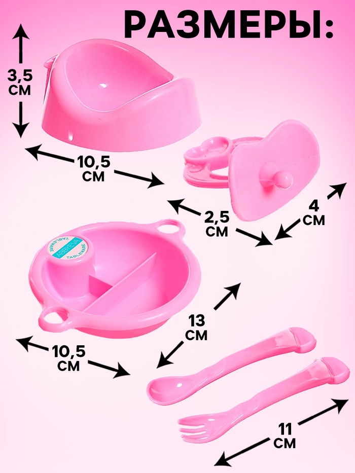 - В комплект входит комплект посуды (тарелка, вилка, ложка), горшок и соска.