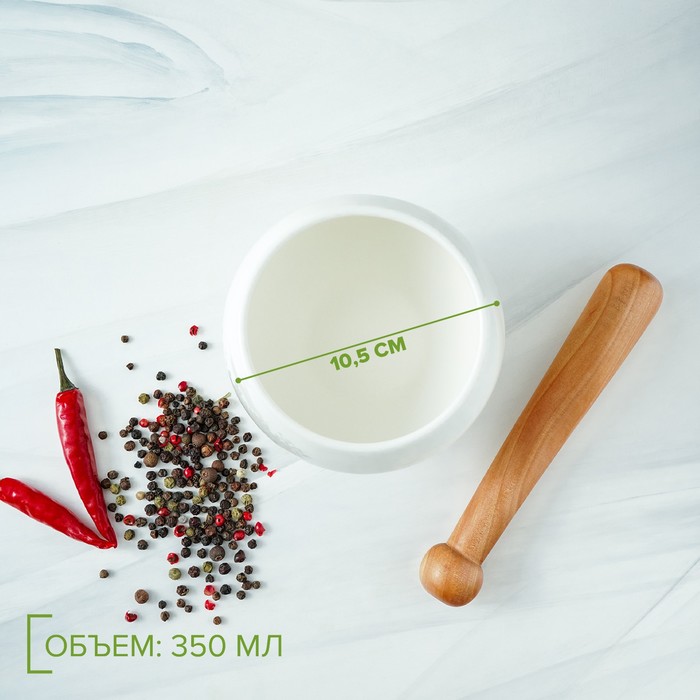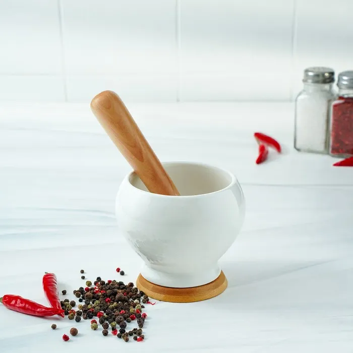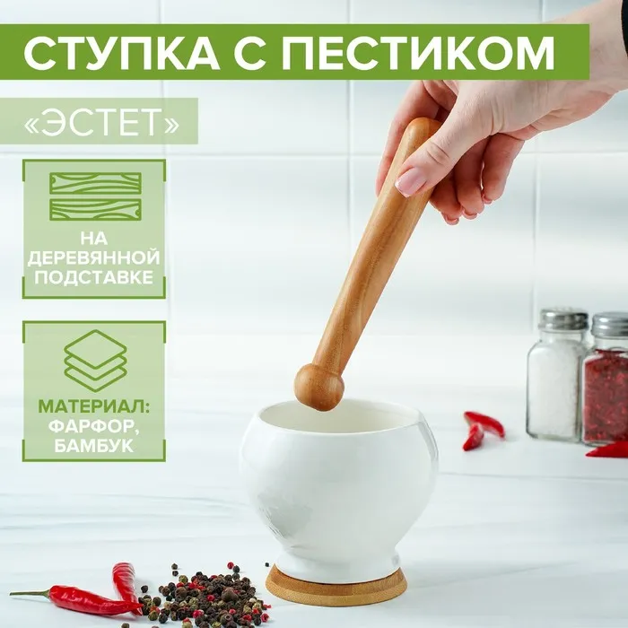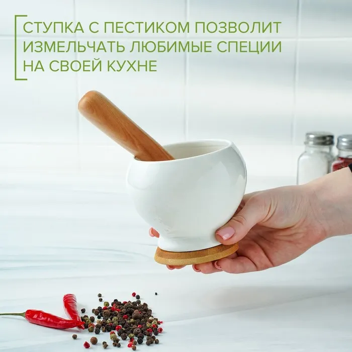 Ступка фарфоровая для специй с пестиком на деревянной подставке Доляна «Эстет», 10,5×9,5 см, цвет белый — Характеристики