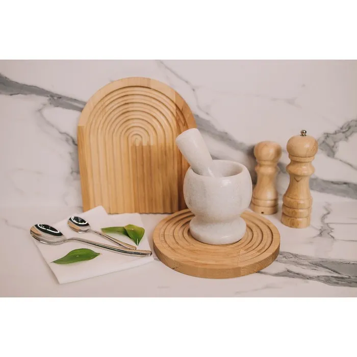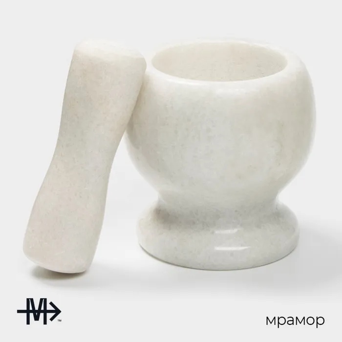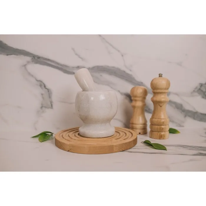 Ступка с толкушкой из натурального мрамора - это элегантное и функциональное кухонное приспособление, используемое для измельчения и приготовления различных специй, трав и пряностей.