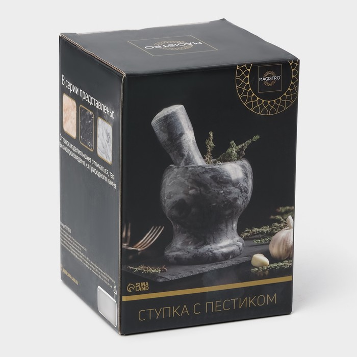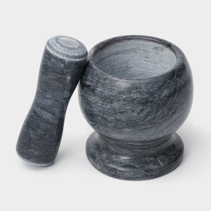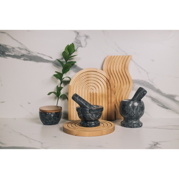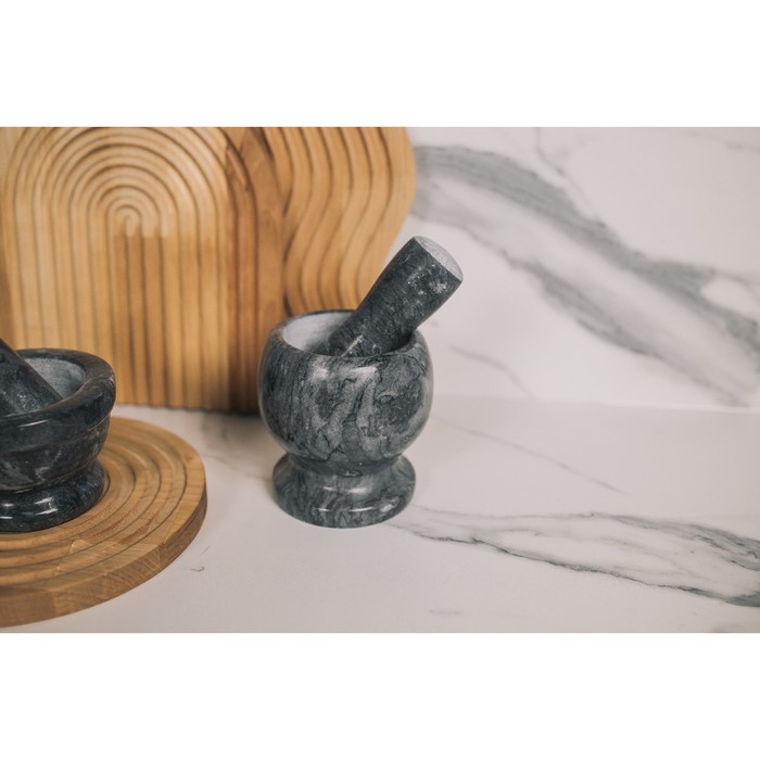 Ступка с толкушкой из натурального мрамора - это элегантное и функциональное кухонное приспособление, используемое для измельчения и приготовления различных специй, трав и пряностей.