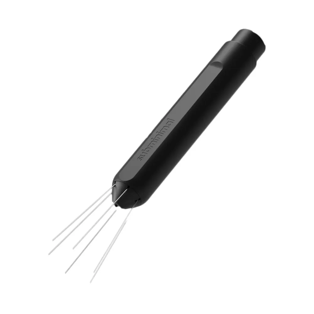 Этот инструмент Subminimal WDT предназначен для обеспечения идеально равномерного распределения молотого кофе. Он интуитивно понятен, забавен и абсолютно безопасен благодаря втягивающимся иглам – одно нажатие, и иглы появляются, когда они вам нужны, и одним движением они исчезают обратно. Подготовка кофейной таблетки никогда не была такой простой!