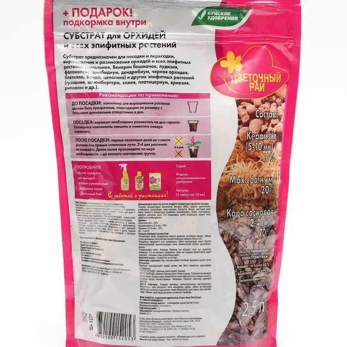 Субстрат предназначен для посадки и пересадки, выращивания и размножения орхидей (мильтония, Венерин башмачок, лудизия, фаленопсис, цимбидиум, дендробиум, черная орхидея, блетилла, Ванда, целогина) и других эпифитных растений (гузмания, шлюмбергера, эхмея, платицериум, вриезия, рипсалис и др.).