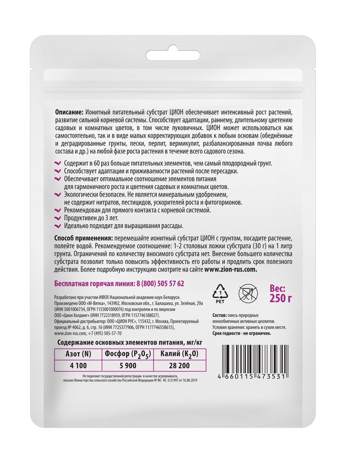 Перемешайте ионитный субстрат с грунтом, посадите растение, полейте водой. Рекомендуемое соотношение: 1-2 столовых ложки субстрата (30 г) на 1 литр грунта. Ограничений по количеству вносимого субстрата нет. Внесение большего количества субстрата позволит только повысить эффективность его работы и продлить срок полезного действия.