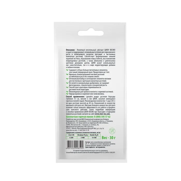 Субстрат ионитный, для выращивания комнатных растений, 30 г, ZION — Характеристики