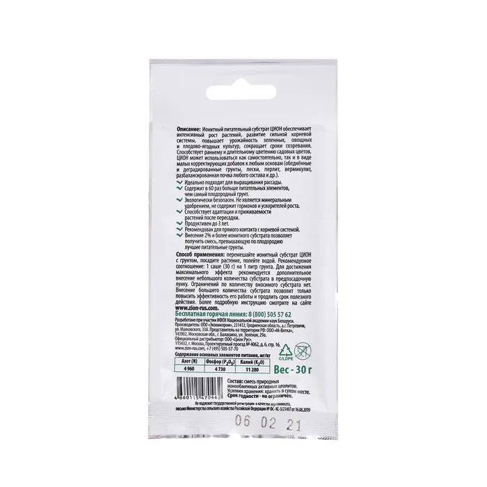 Субстрат ZION «Классик», ионитный, безнитратная питательная добавка для растений, 30 гр — Характеристики