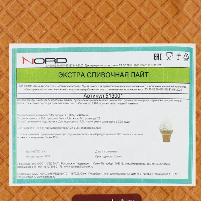 - Для получения мягкого мороженого 1 кг сухой смеси растворить в 2,8 – 3,0 л воды или молока, смешать и выдержать 20 минут перед заливкой во фризер.