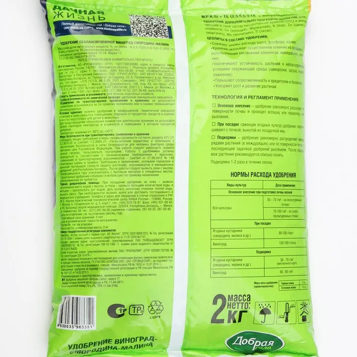 Минеральное удобрение для винограда с цеолитами. Увеличивает сахаристость и сочнось ягод и повышает сопротивляемость к вредителям и болезням. Удобрение рекомендовано для всех сортов винограда и всех ягодных кустарников. Коринка, дамские пальчики и кишмиш. Изабелла, рислинг, каберне, совиньон, пино, шардоне, мерло, мускат, фетяска. Обогащено цеолитами, содержащими биодоступный кремний.