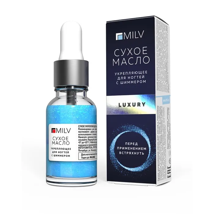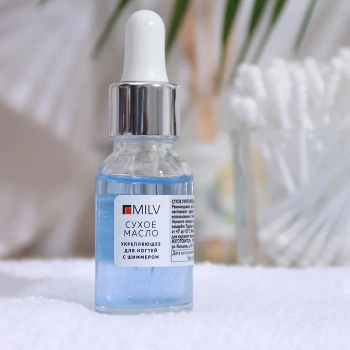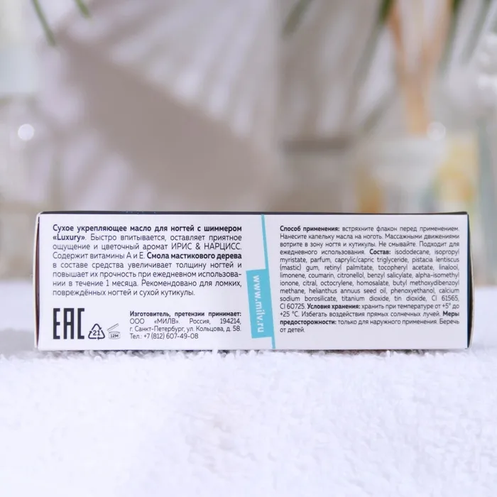 Сухое укрепляющее масло для ногтей с шиммером быстро впитывается, оставляет приятное ощущение и цветочный аромат ириса и нарцисса. Содержит витамины А и Е. Смола мастикового дерева в составе средства увеличивает толщину ногтей и повышает их прочность при ежедневном использовании в течение 1 месяца. Масло рекомендовано для ломких, поврежденных ногтей и сухой кутикулы.