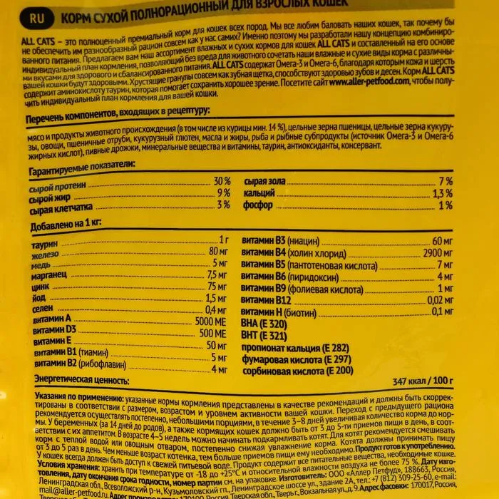 Сухой корм "ALL CATS" для взрослых кошек, 13 кг — Характеристики
