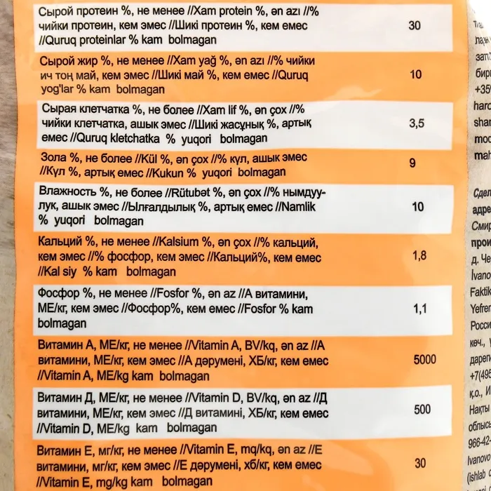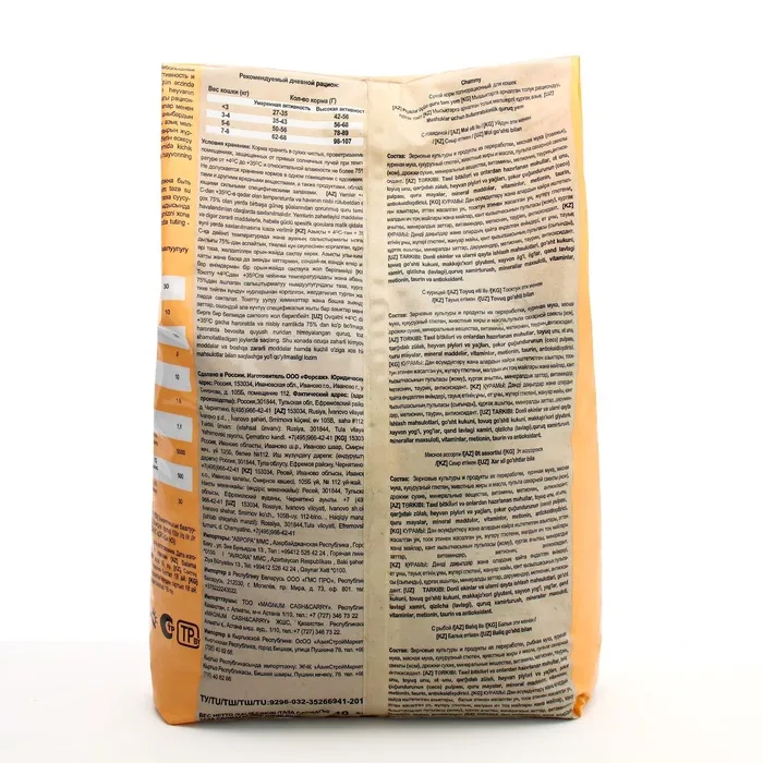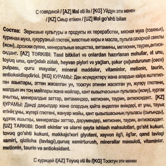 Состав: зерновые культуры и продукты их переработки, мука КРС, куриная мука, кукурузный глютен, животные жиры и масла, свекольный жом, дрожжи сухие, витамины, микроэлементы, метионин, таурин.