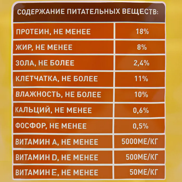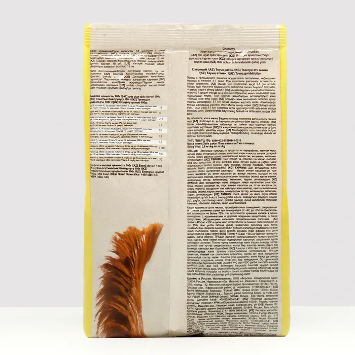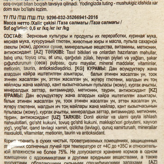 Состав: зерновые культуры и продукты их переработки, куриная мука, мясная мука, рыбная мука, кукурузный глютен, животные жиры и масла, пульпа сахарной свеклы, дррожжи сухие, минеральные вещества, витамины, метионин, таурин, антиоксидант.
