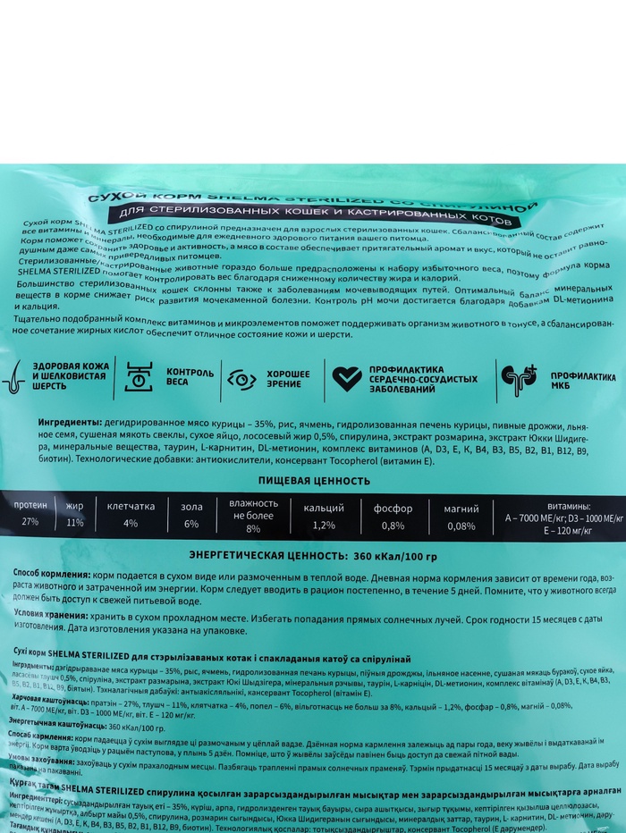 Стерилизованные/кастрированные животные гораздо больше предрасположены к набору избыточного веса, поэтому формула корма SHELMA STERILIZED помогает контролировать вес благодаря сниженному количеству жира и калорий.