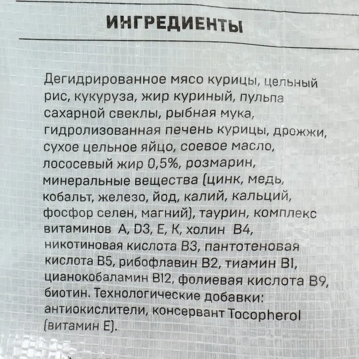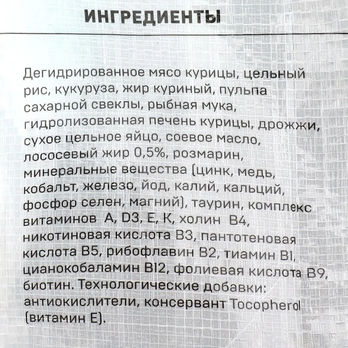 Состав: Мясная куриная мука, рис, кукуруза, жир животный пищевой, мука рыбная, мука мясная, пульпа сахарной свеклы, куриный печеночный экстракт, семена льна, дрожжи, соевое масло, минеральные вещества (цинк, медь, кобальт, железо, йод, калий, кальций, фосфор селен, магний), антиоксиданты, таурин, комплекс витаминов А, D3, Е, К, холин В4, никотиновая кислота В3, пантотеновая кислота В5, рибофлавин В2, тиамин В1, цианокобаламин В12, фолиевая кислота В9, биотин.