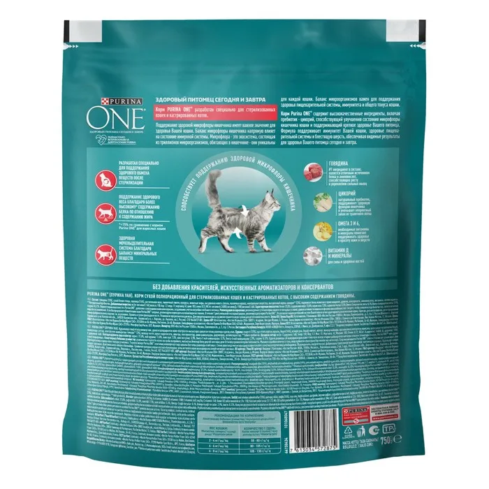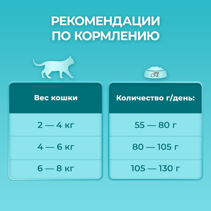 Рекомендации по приготовлению/использованию: Если вы предлагаете Вашей кошке корм Purina ONE® (Пурина Уан) впервые, рекомендуем переводить на новый корм постепенно. В течение 7 дней уменьшайте исходный рацион, увеличивая дозу корма Purina ONE® (Пурина Уан). Это позволит пищеварительной системе Вашей кошки лучше адаптироваться к изменению корма.