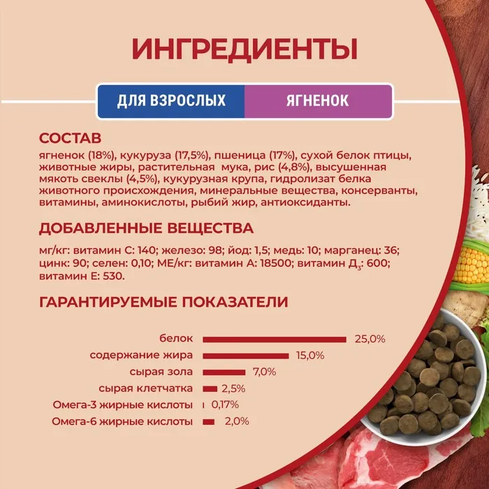 Состав товара: ягненок (17%), пшеница (15.5%), кукуруза, сухой белок птицы, пшеничный глютен, животный жир, кукурузная крупа, высушенная мякоть свеклы, рис (4%), минеральные вещества, гидролизат белка животного происхождения, глицерол, рыбий жир, поджаренная солодовая мука, витамины, аминокислоты, антиоксиданты.