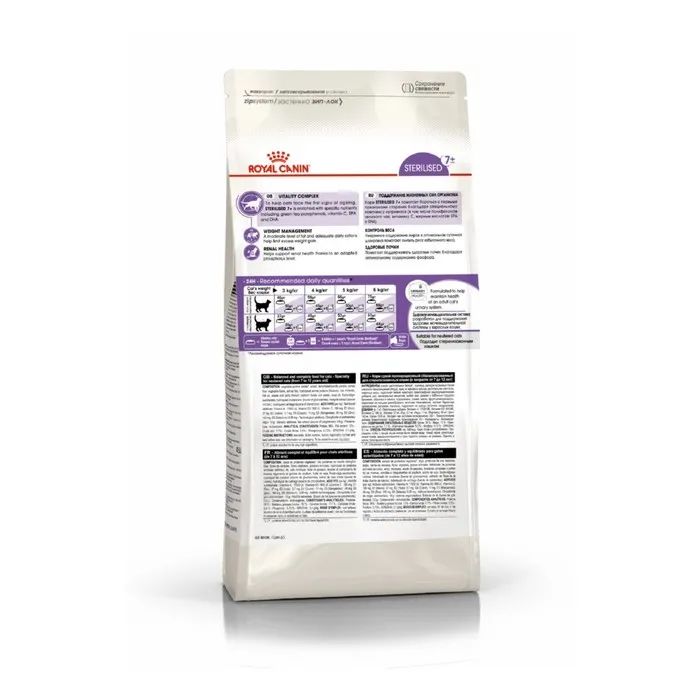 Рацион ROYAL CANIN® Sterilised 7+ учитывает особые потребности этих кошек и помогает: справитьтя с первыми признаками старения; поддерживать оптимальный вес кастрированных и стерилизованных кошек; поддерживать здоровье мочевыделительной системы; 100% полнорационное и сбалансированное питание.