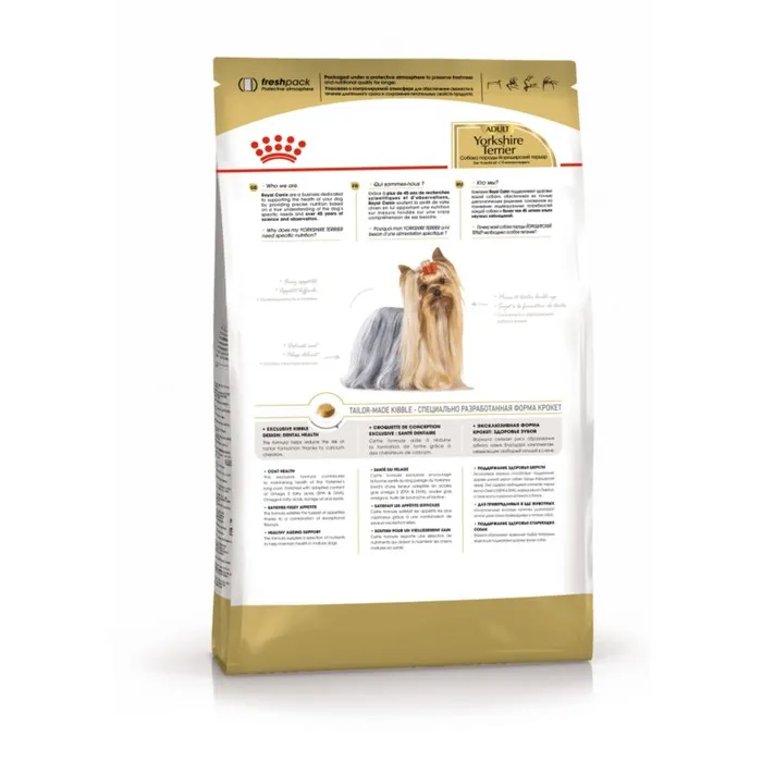 Йоркшир терьер: сухой корм для взрослых собакс 10-месячного возраста. Йоркширский терьер — это сказочное создание, которое очаровывает с первой минуты знакомства с ним. Тоненькие, хрупкие и изящные йорки в силу своей физиологии нуждаются в максимальном поступлении в организм аминокислот, необходимых для развития шерсти и ее быстрого роста.Эксклюзивная форма и размер крокет способствуют механической чистке зубов, что ограничивает образование зубного камня.Способствует сохранению здоровья шерсти благодаря присутствию жирных кислот Омега 3 и 6, масла огуречника и биотина.