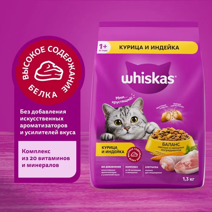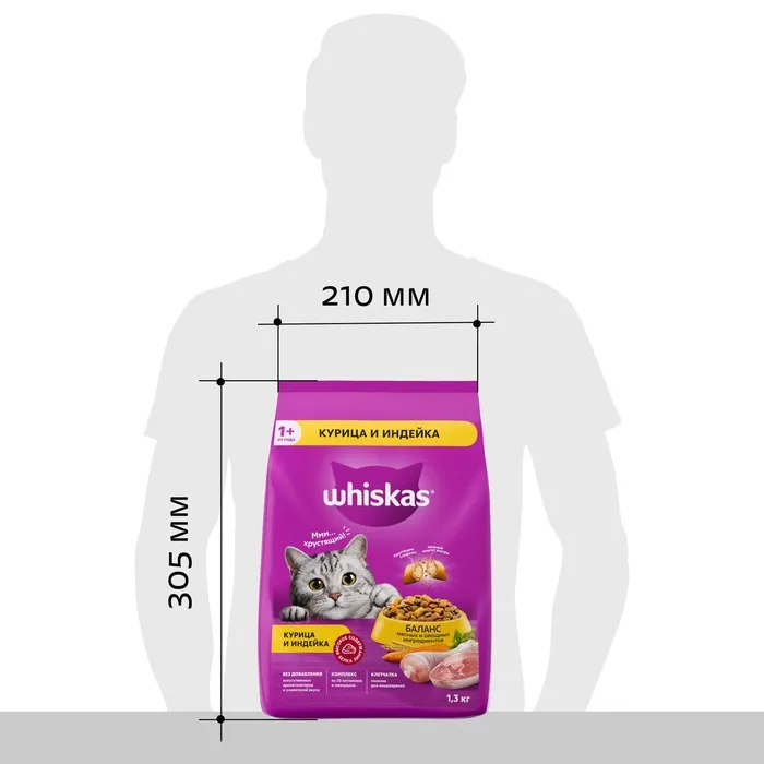 Сухой корм Whiskas для кошек, курица/индейка, подушечки, 1,3 кг — Характеристики