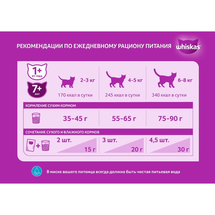 Нужно помнить, что смешивать в одной миске сухой и влажный рационы не рекомендуется. Кроме того, у вашей любимицы всегда должен быть доступ к чистой питьевой воде. Рационы Whiskas® содержат все необходимые витамины и минералы, белки, жиры и углеводы, чтобы поддержать здоровье Вашей кошки от усов до кончика хвоста.