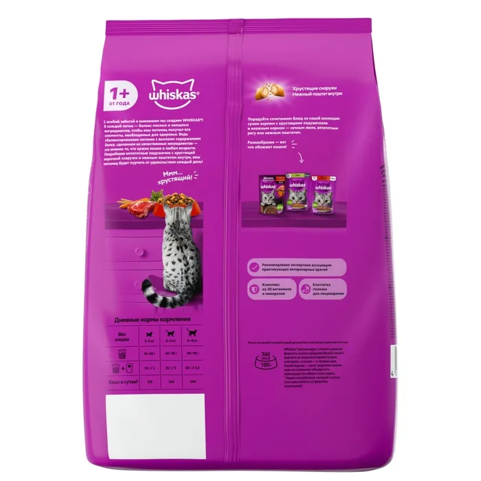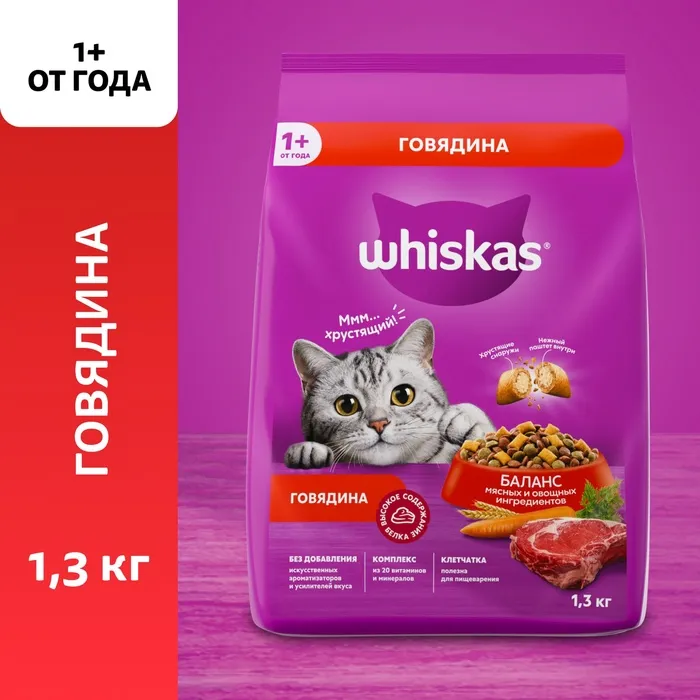 Сухой корм Whiskas для кошек, подушечки, паштет с говядиной,1,3 кг — Характеристики