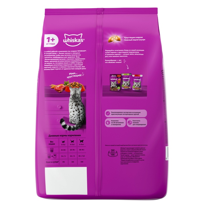 Рекомендации: При переходе с другого корма смешивайте его с Whiskas в пропорции 25/75, постепенно увеличивая долю нового корма в течение недели. Всегда обеспечивайте кошке доступ к свежей воде — это важно при кормлении сухими гранулами.
