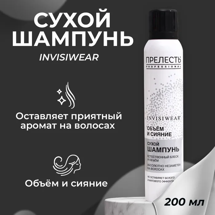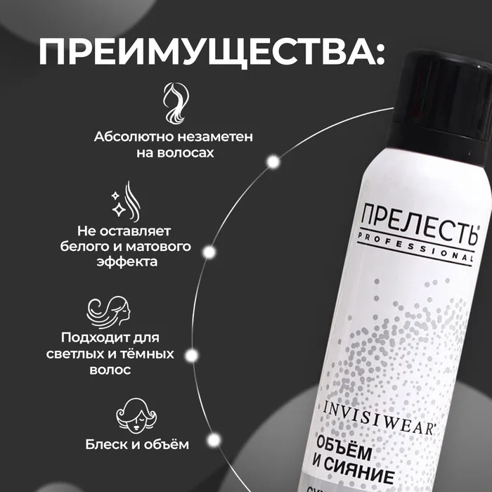 Сухой шампунь Прелесть Professional Объем и сияние, подходит для женщин, мужчин, подростков. С его помощью можно за 5 минут привести волосы в порядок, убрав жирный блеск.